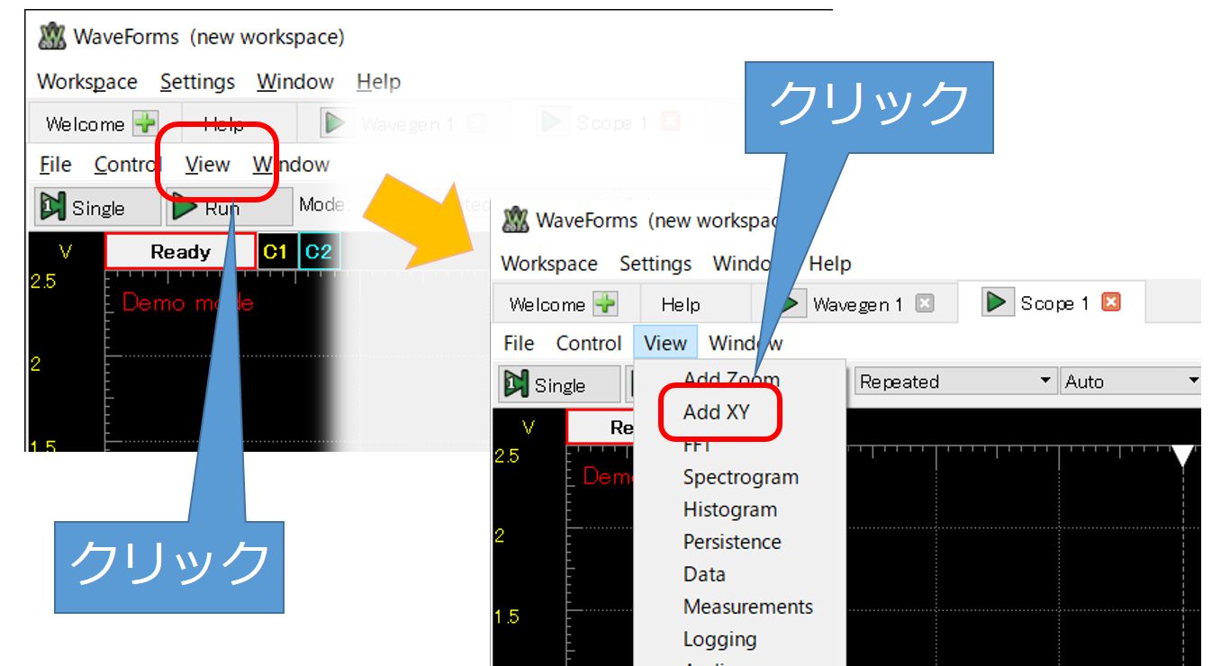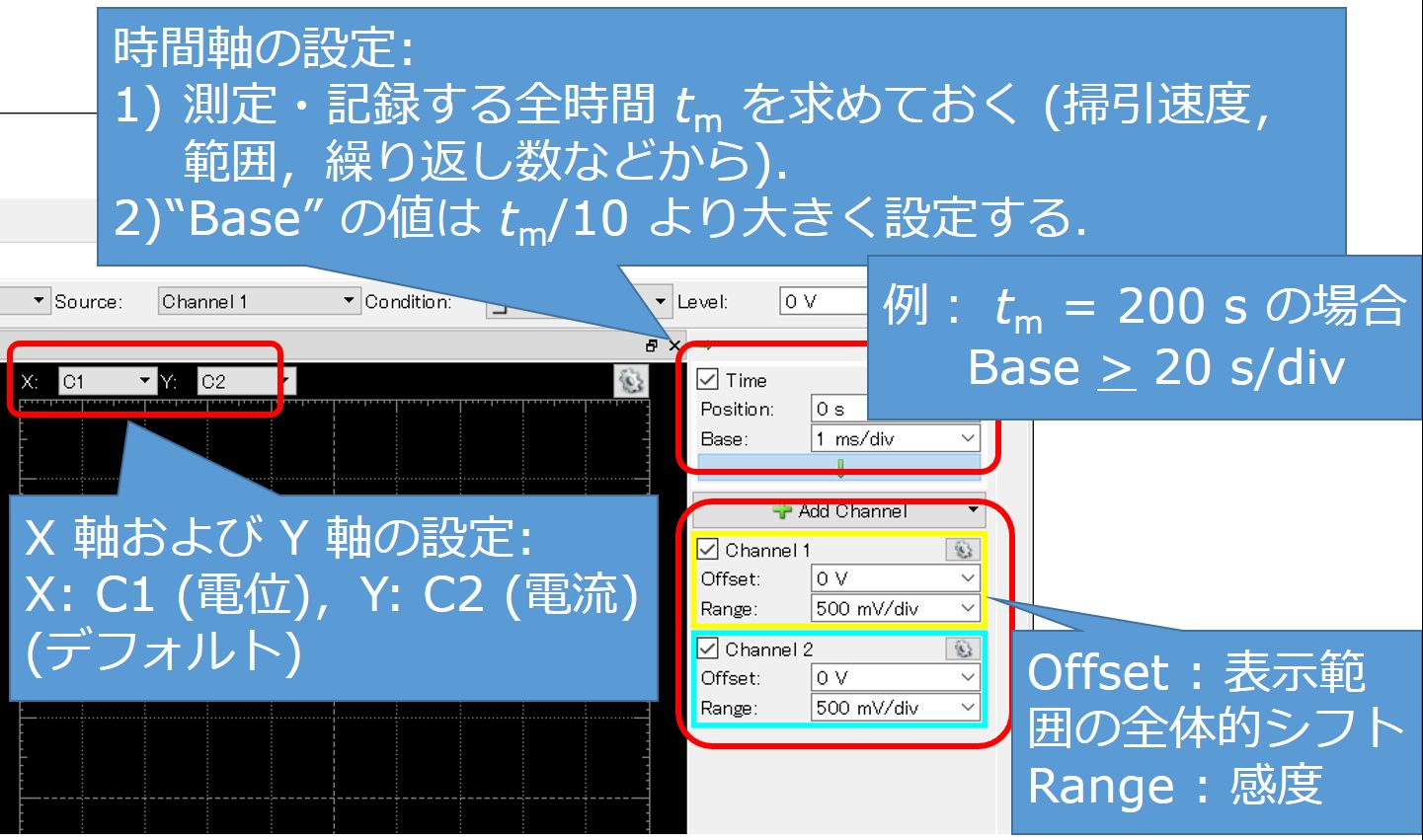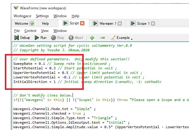 WaveForms を起動し,メニューの Workspace からCV.dwf3work を読み込む. Script ペイン (あるいはタブ) で,掃引条件を設定する (Fig. 4.1 (右図) 参照).