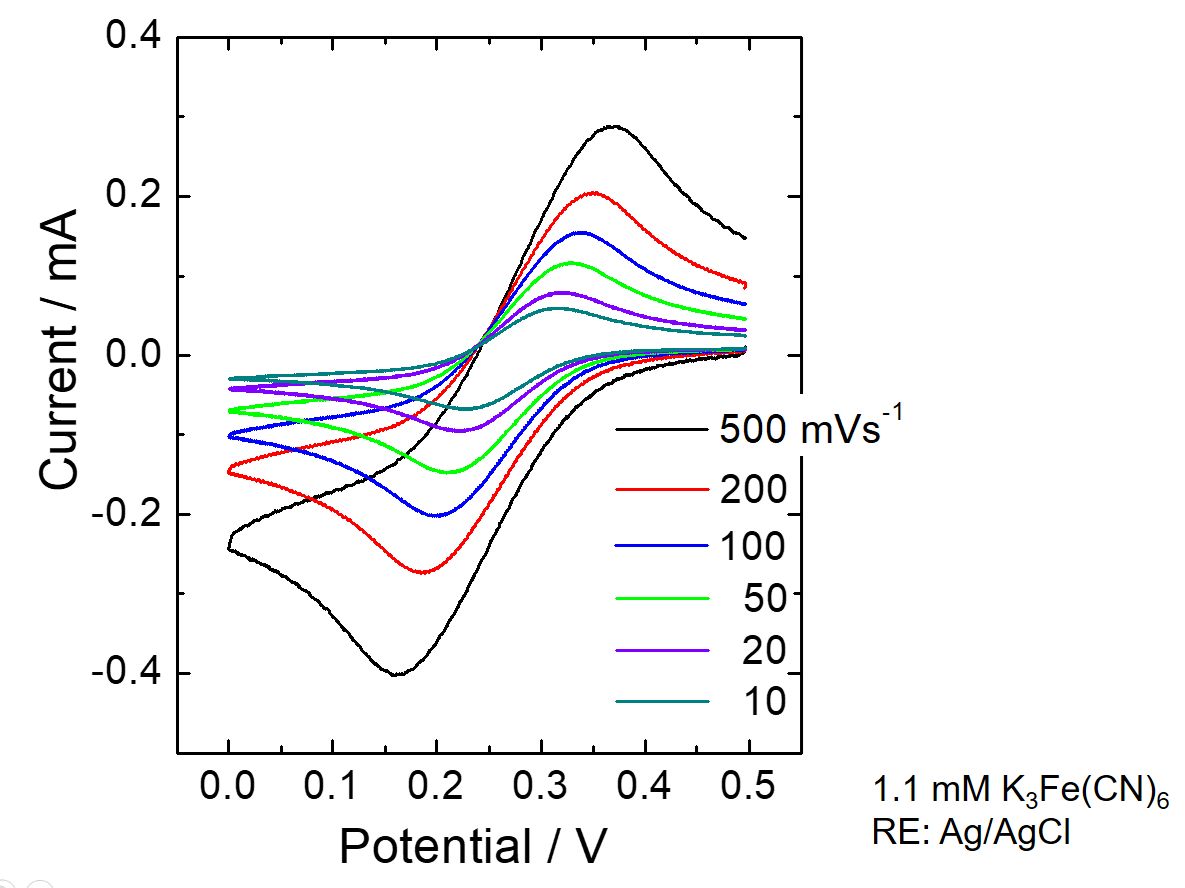 掃引速度を変えて測定した結果をまとめた例を Fig. 4.4 (右図) に示す. (作用極 ITO,約 1 cm2) |