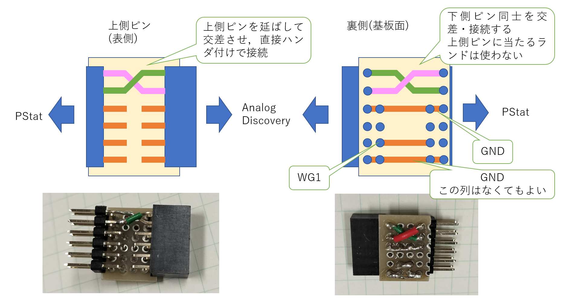 ポテンショスタット拡張基板と Analog Discovery の接続には基板上に接地した 30 ピンコネクタを使っているが,実際に電気的な接続が行なわれているのは実質的には 6 本だけである (GND だけは複数ピンに割り当てられていて,それらも接続しているので,物理的な配線としては 7 箇所で接続).