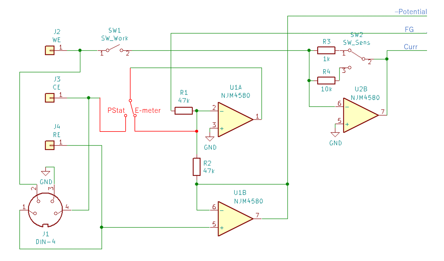 しかし,この切り替えは基本的にはスイッチ一つを追加すれば済むので,基板上にスイッチを追加することで,ポテンショスタットと自然電位測定のためのエレクトロメータを切り替えられるようにする改造例を紹介する.