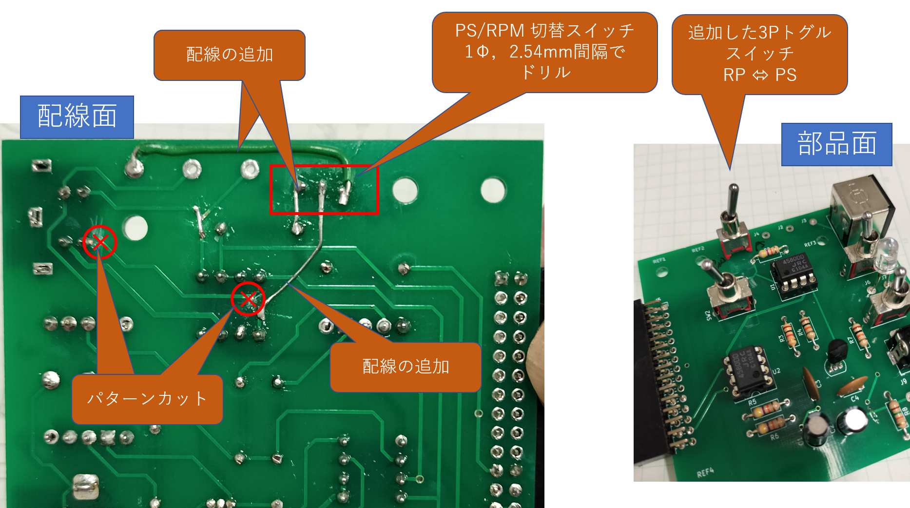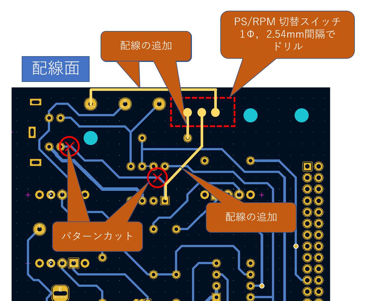 加工例では基板の他のところで使っているものに類似した形状の3Pトグルスイッチ (例) を使用した.ただし,基板に安定して固定するための金具がないもので,スイッチの端子分の3つの穴が必要になる.他のところで使っているものと同じものを使う場合は,ドリルを5箇所にするか,固定用足は根元で切り取ってもよい.