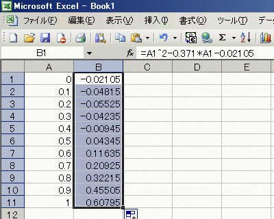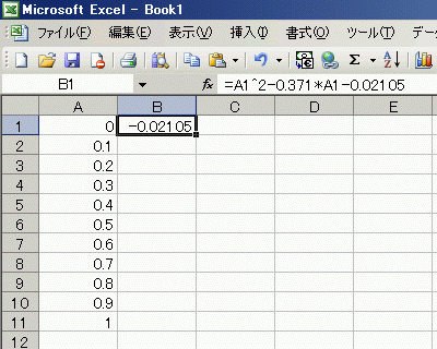 図の例だと B1 には =A1^2-0.371*A1-0.02105 と書き込む.