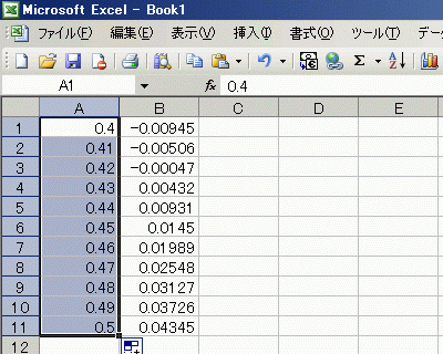 ここまでで,この例題では 0.4 と 0.5 の間に解があることがわかった.そこで A列で設定する計算範囲をこの範囲に絞る.すなわち,たとえば A 列の値を 0.4 から 0.01 きざみで 0.5 まで,というように再設定する.B 列の計算結果は自動的に変更される.