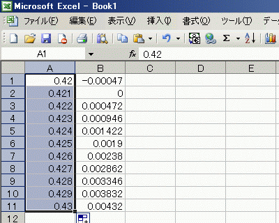 このように 0 にならなくても,たとえば 0.42143 と 0.42144 の間にあるところまで追い込めれば,0.4214 まで,つまり4桁の精度は確実にあるわけだし,次の桁も±1の誤差範囲まで追い込めているので,0.42143 または 0.42144 を解として有効数字5桁を主張できることになる.0.42143 をとるか 0.42144 をとるかは,B列の数値 (絶対値) の小さい方をとっておけばよい.